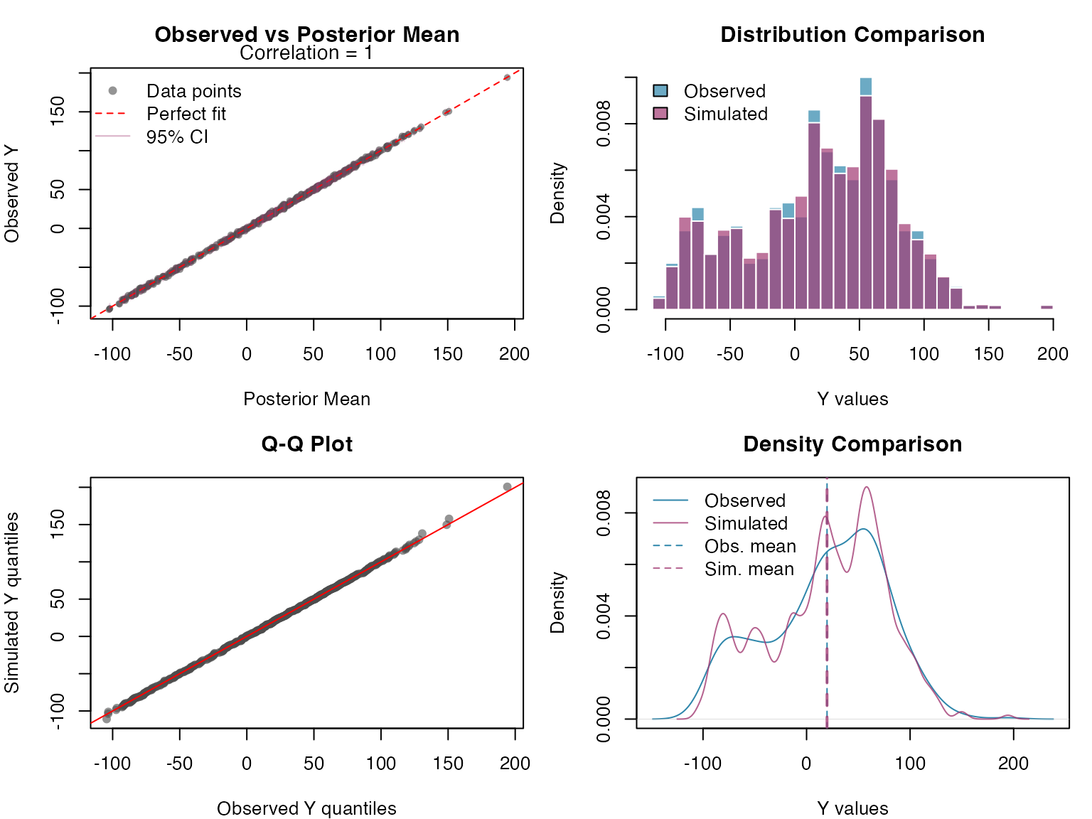 We now assess model adequacy by generating posterior predictive samples for the response variable (Y) and comparing them with the observed data:
