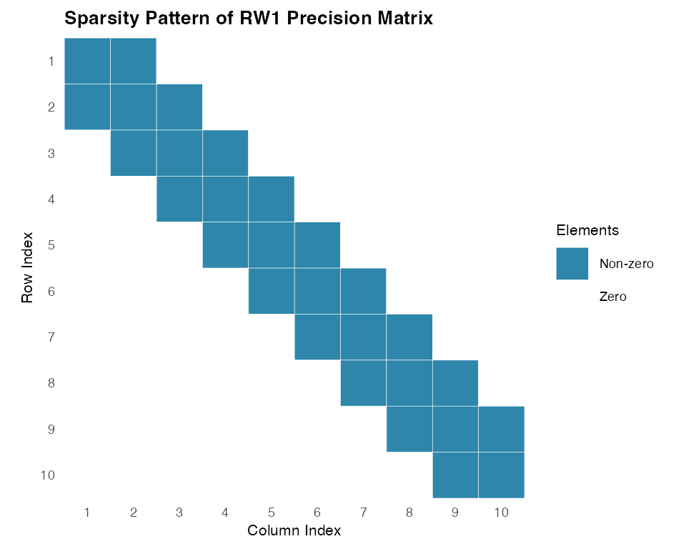 - RW2: Penta-diagonal precision matrix (sparse structure)