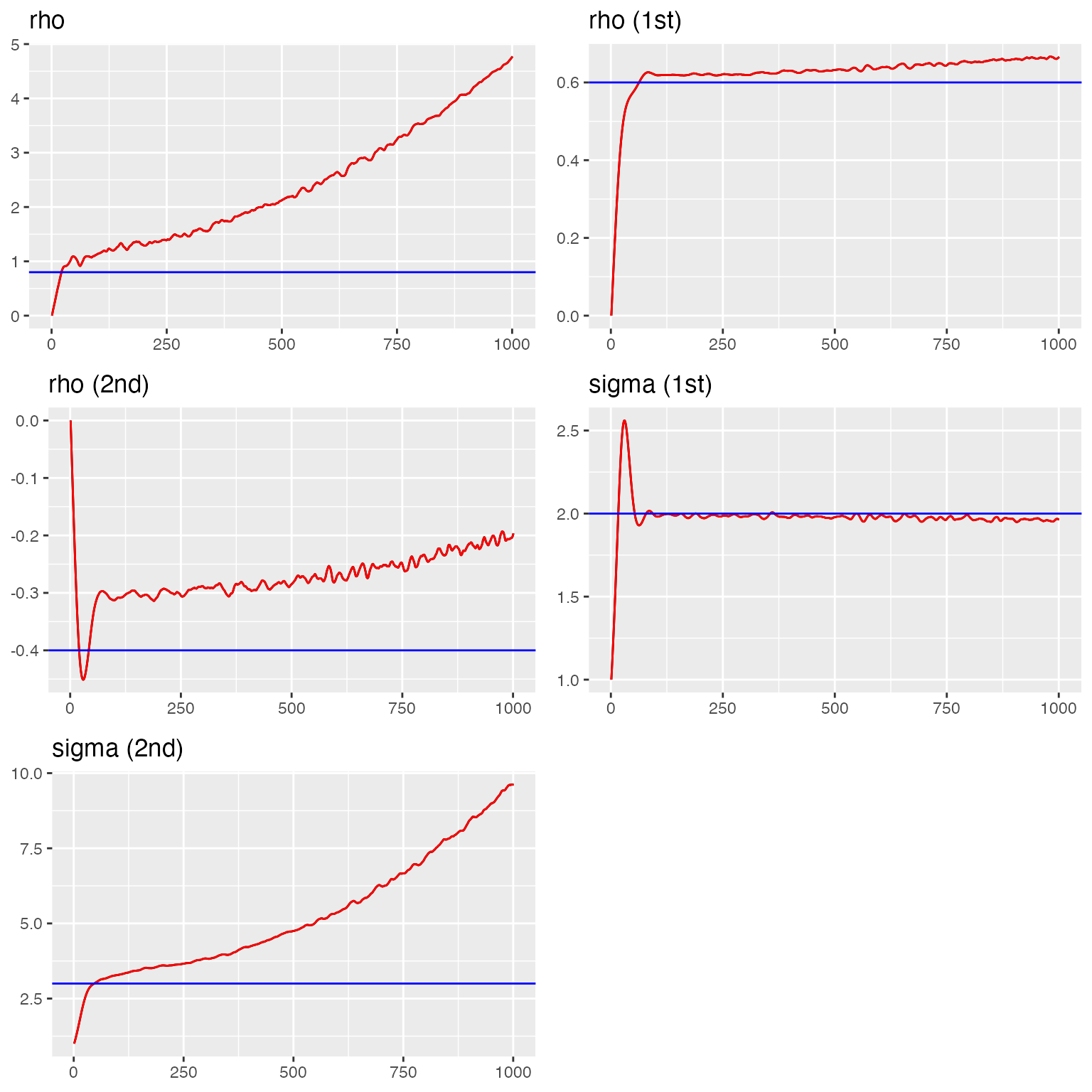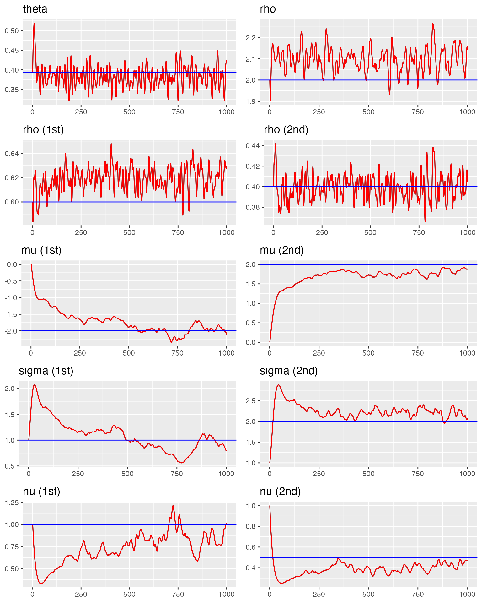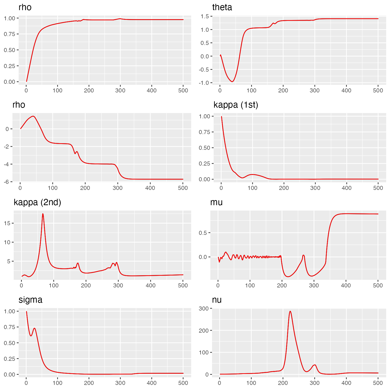 #> sigma = 0.57We visualize the convergence of MCMC chains for the space-time bivariate model.