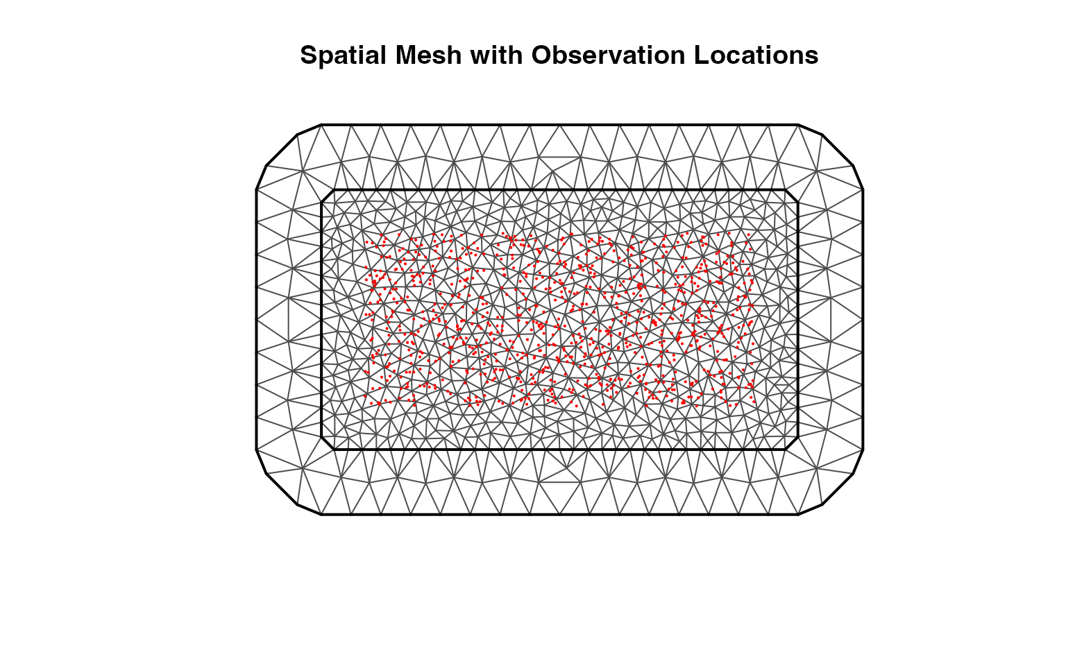 The spatial mesh triangulation adapts to the domain geometry while ensuring adequate resolution near observation locations:
