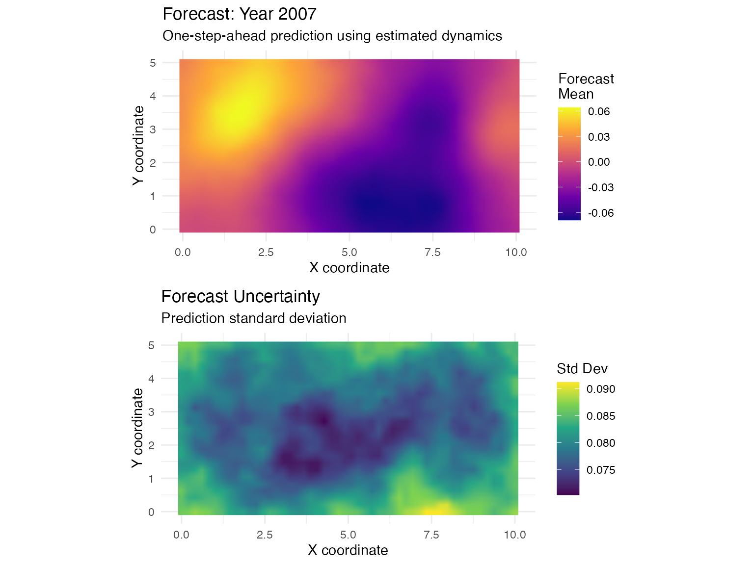 Bottom panel: Displays prediction uncertainty (standard deviation). Uncertainty is relatively uniform across the domain because we’re forecasting only one step ahead and the temporal correlation (through parameter ) maintains information from the final observed year. Multi-step-ahead forecasts would show increasing uncertainty as temporal distance from observations grows.