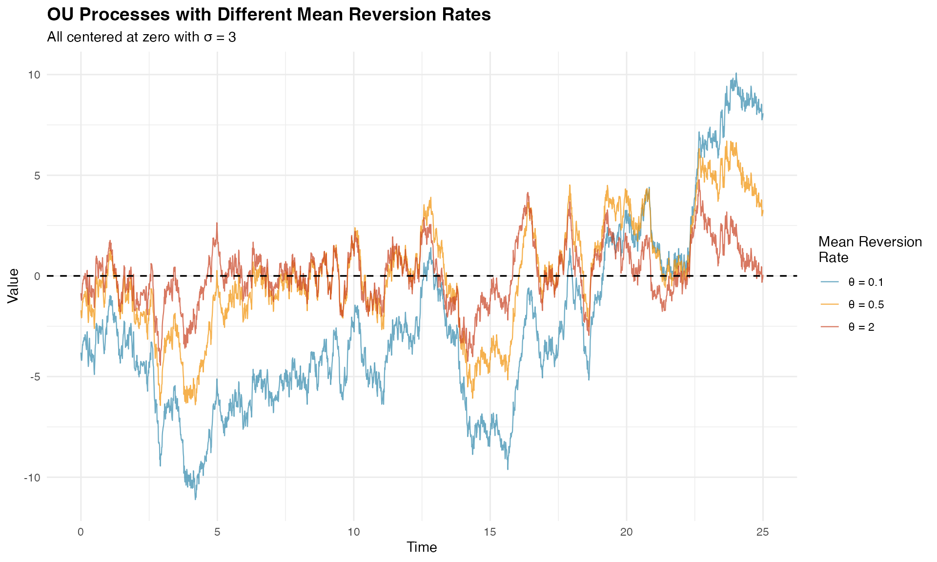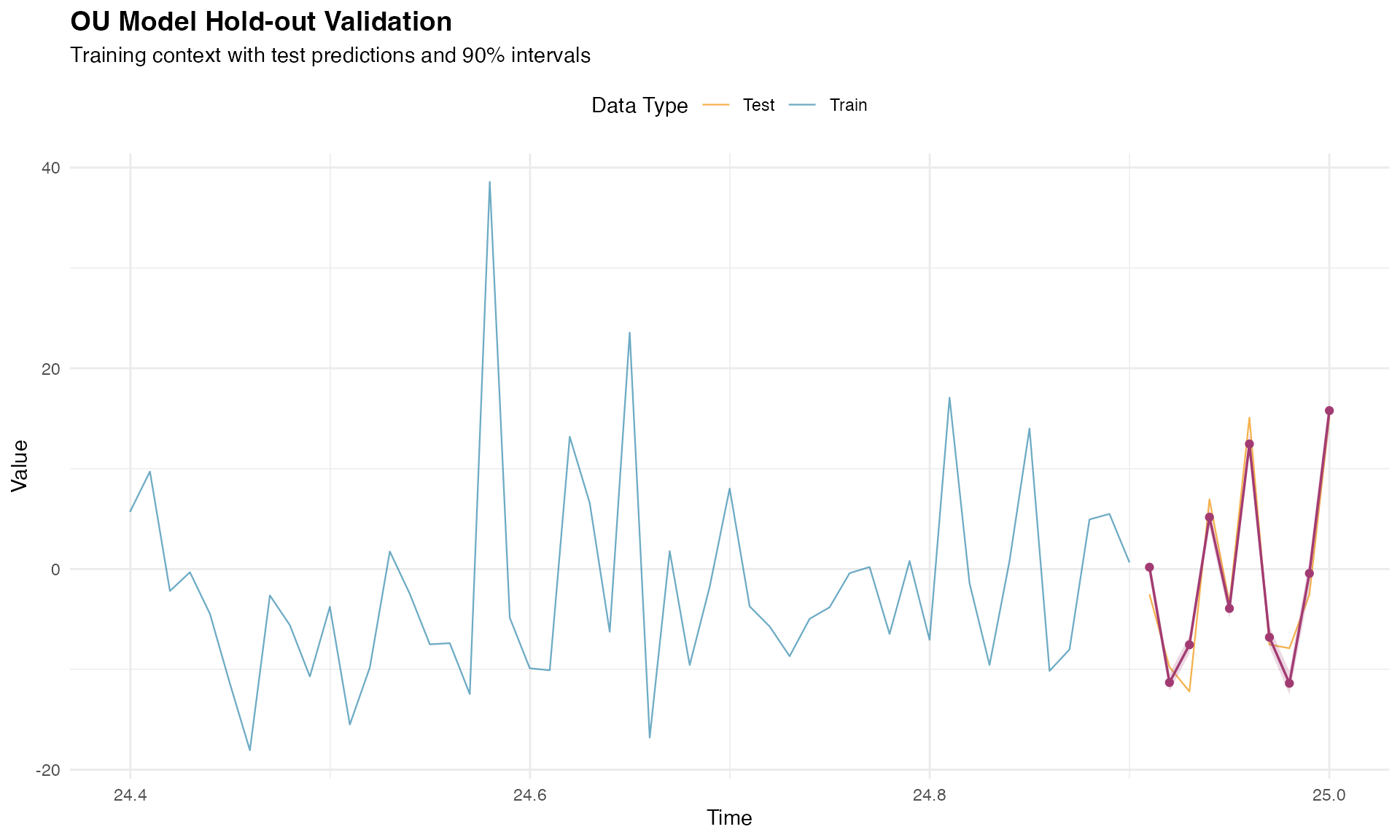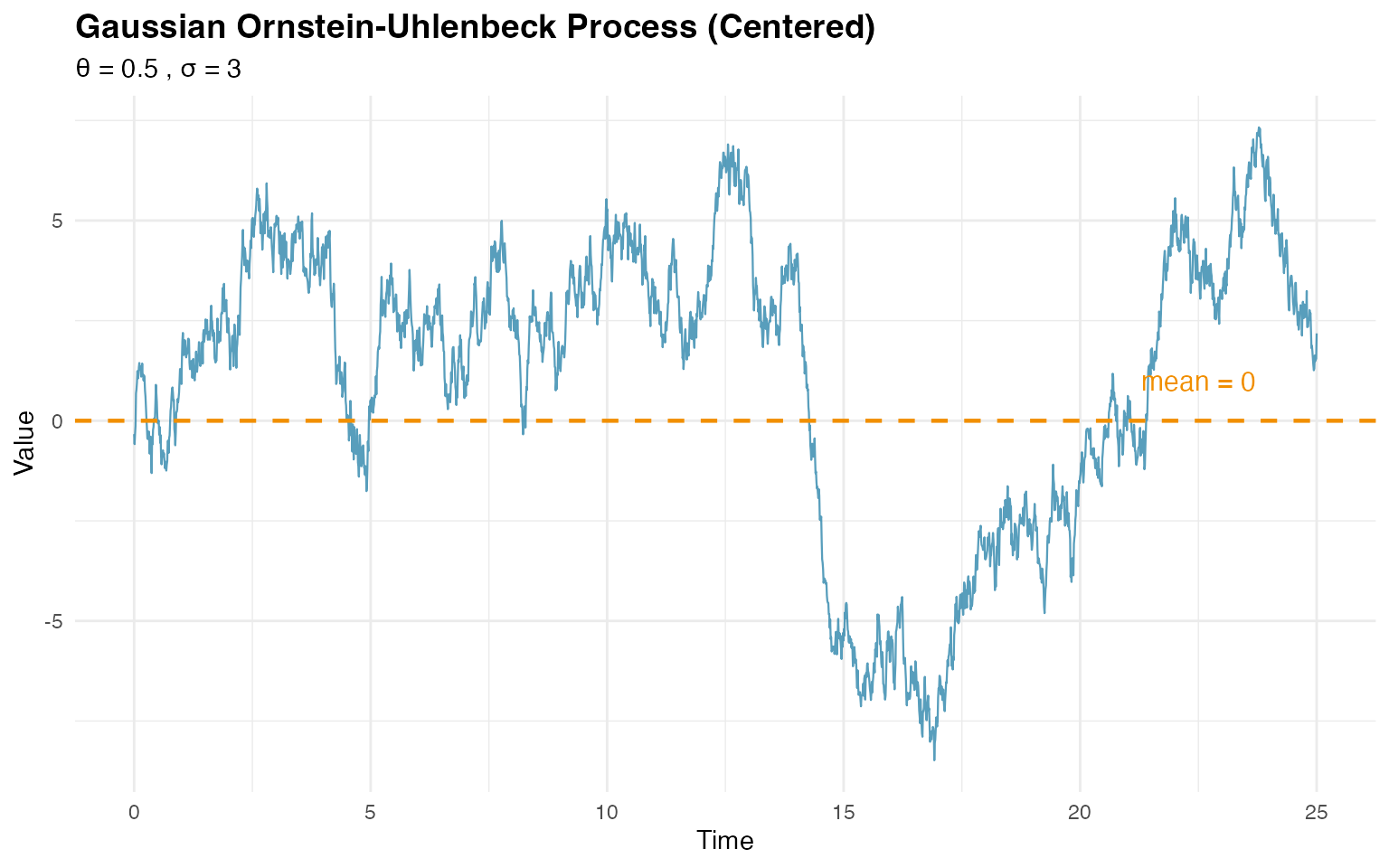 Note: The OU process in this vignette is centered at zero. If your data has a non-zero mean, you should either: 1. Center the data before fitting 2. Include an intercept or other fixed effects in your regression model to capture the mean