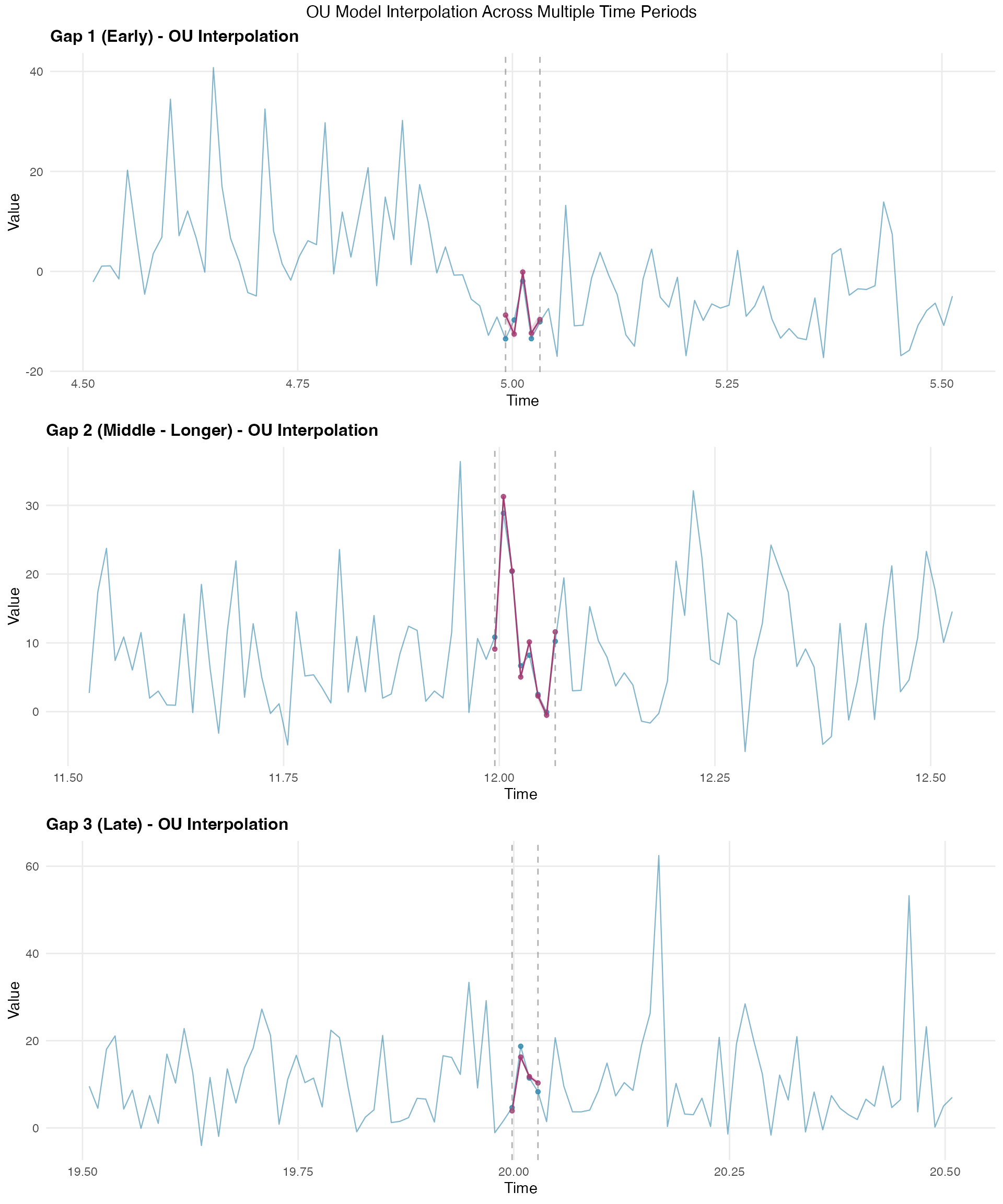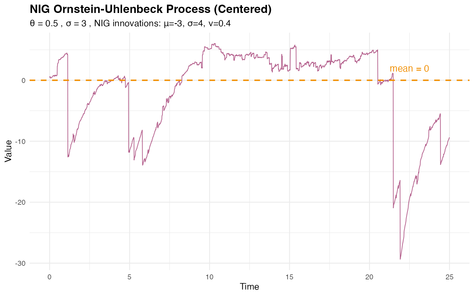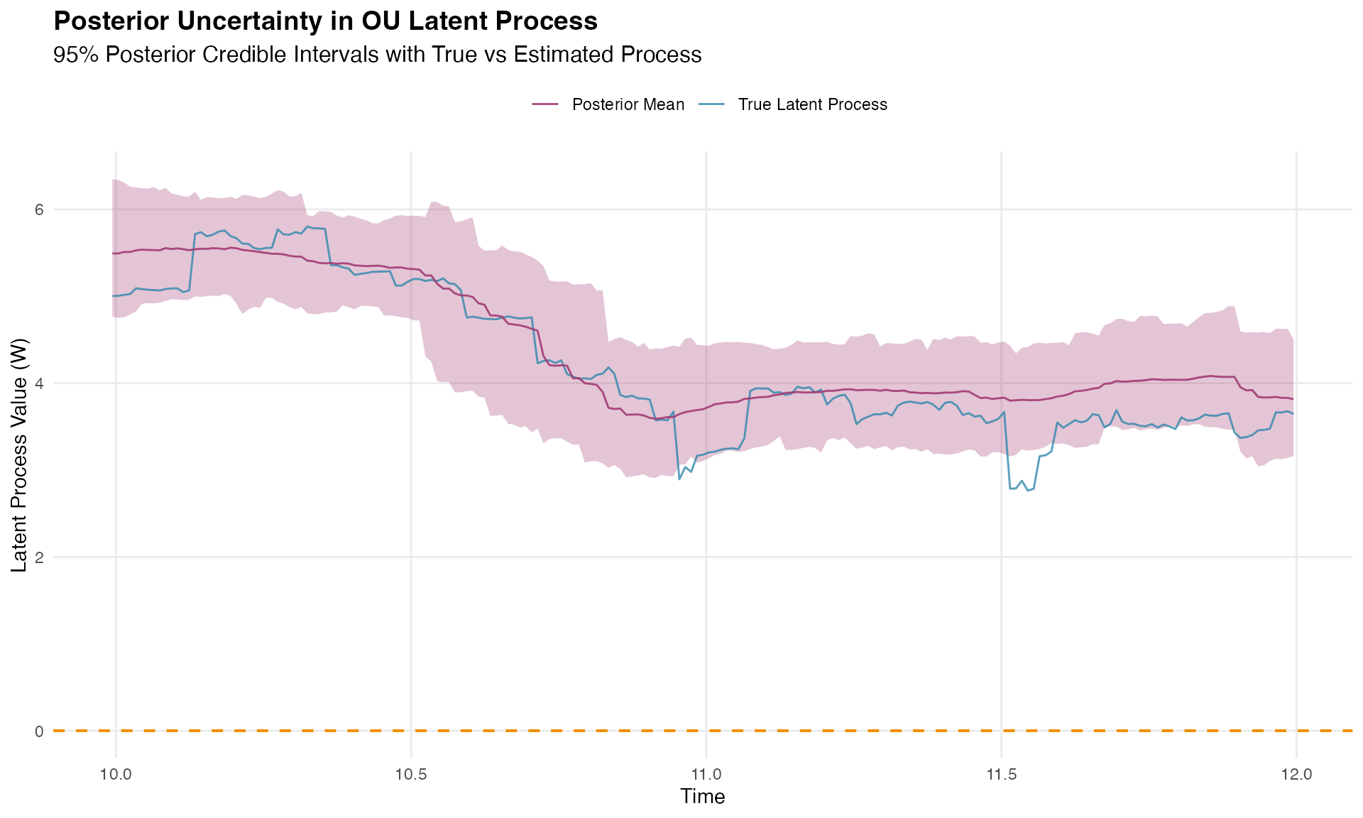 Note: The OU process in this vignette is centered at zero. If your data has a non-zero mean, you should either: 1. Center the data before fitting 2. Include an intercept or other fixed effects in your regression model to capture the mean
