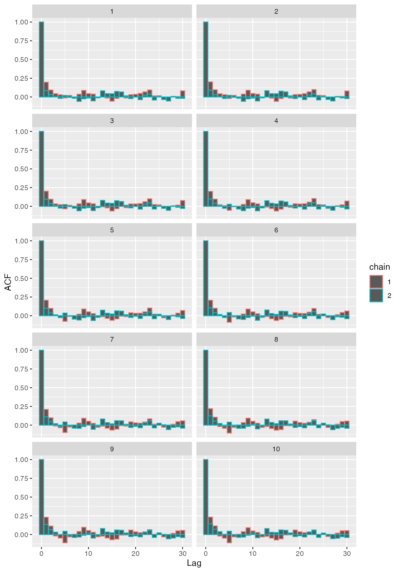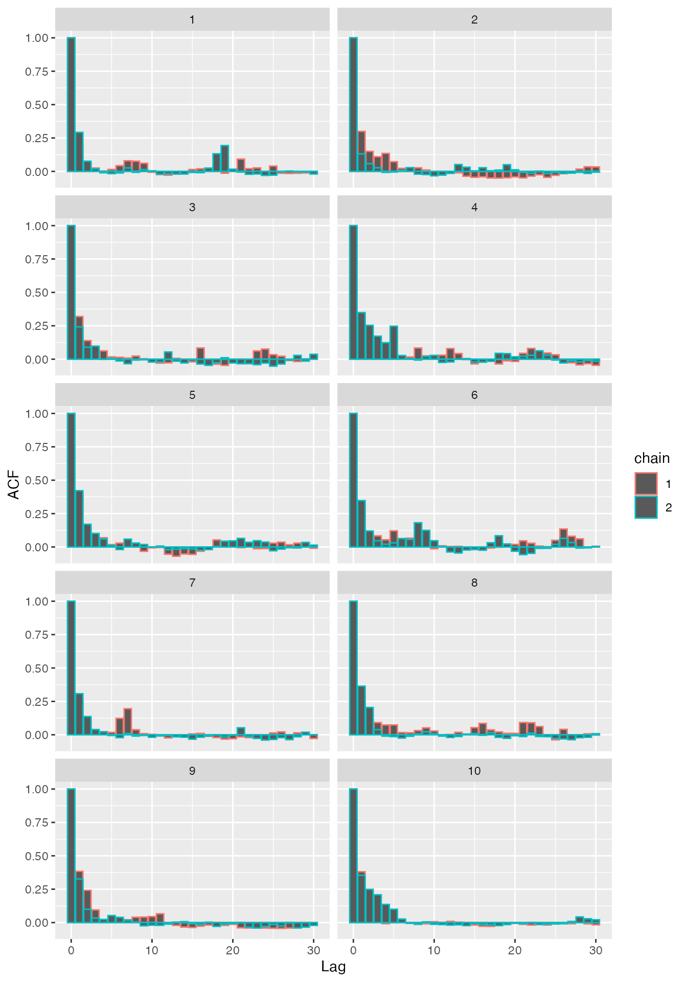 ggplot(df_V_acf, aes(x = lag, y = acf, col = chain)) +