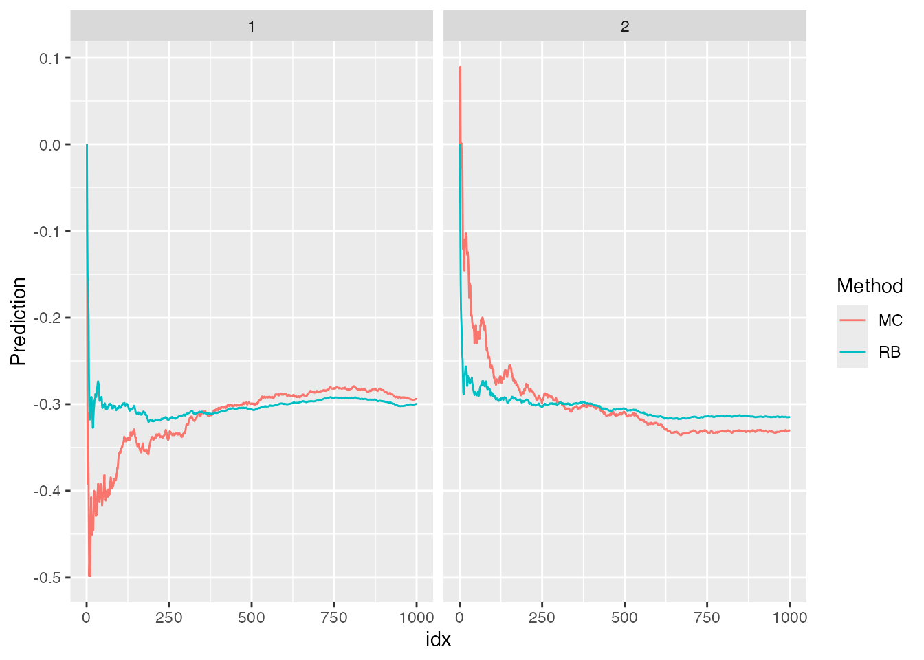 ggplot(df_pred, aes(x = idx, y = Prediction, col = Method)) +