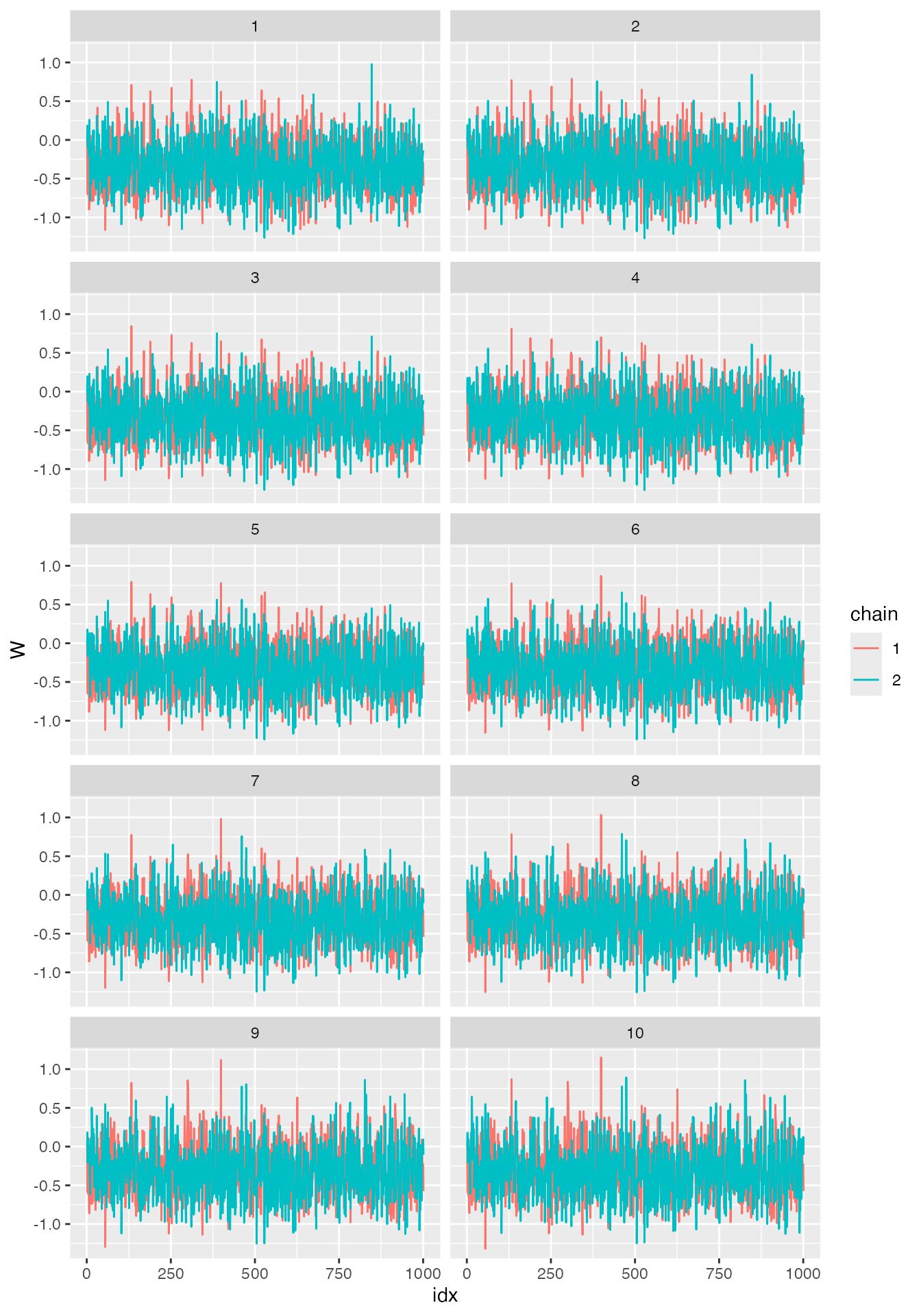 ggplot(df_W, aes(x = idx, y = W, col = chain)) +