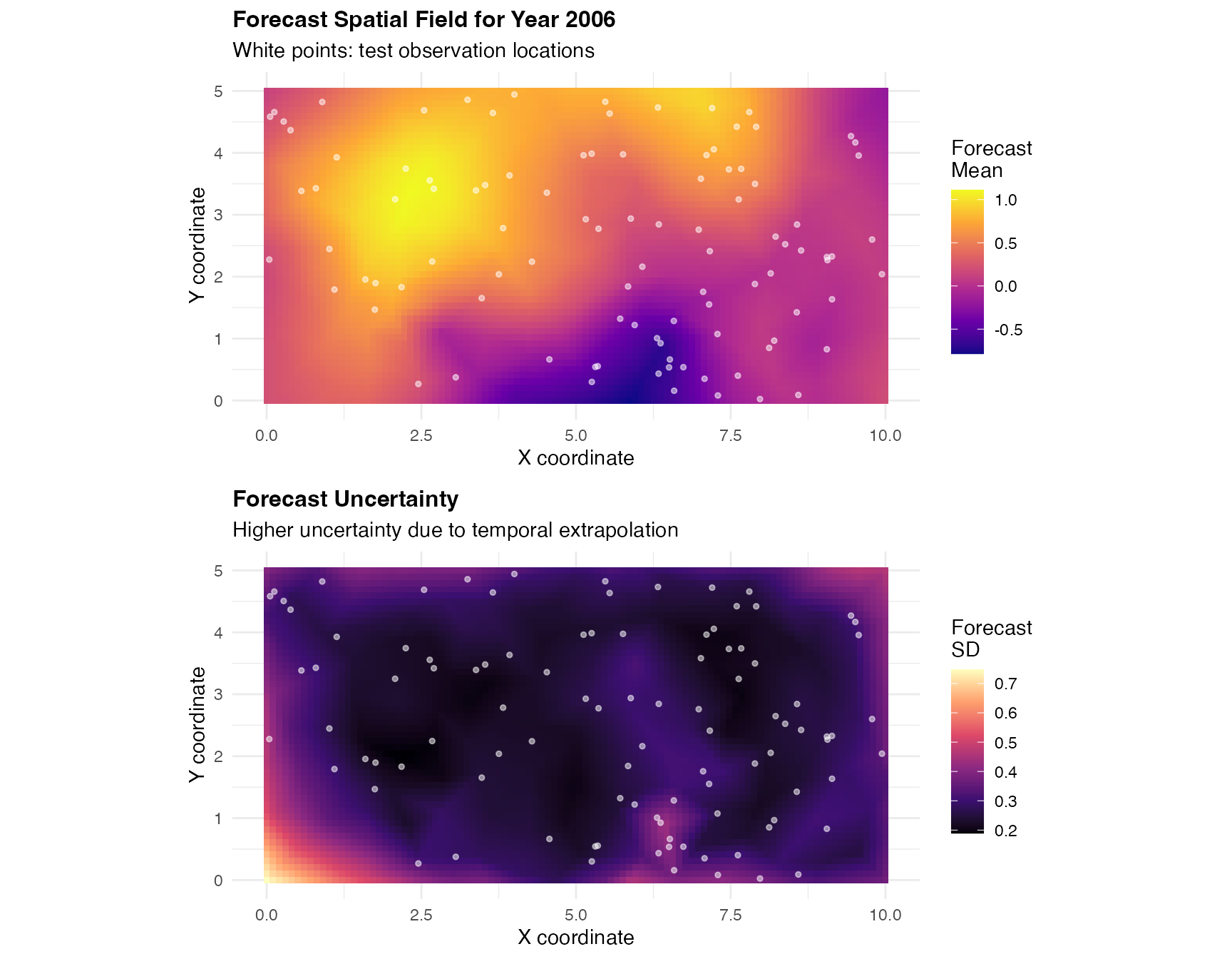 The forecast field shows spatial patterns for year 2006 based on the model trained on 2001-2005. The uncertainty panel reveals that forecast uncertainty is higher than interpolation uncertainty due to temporal extrapolation beyond the training period.