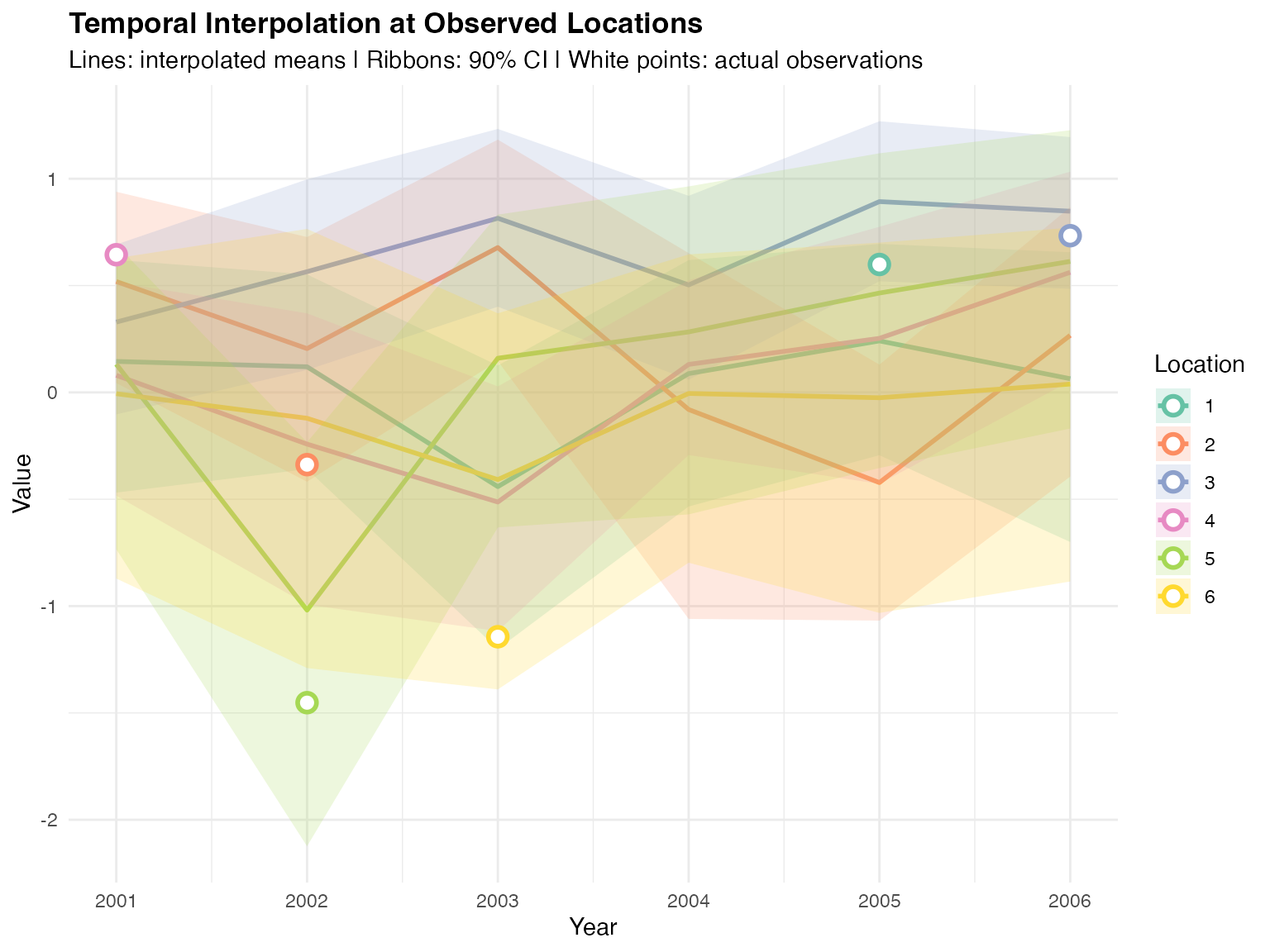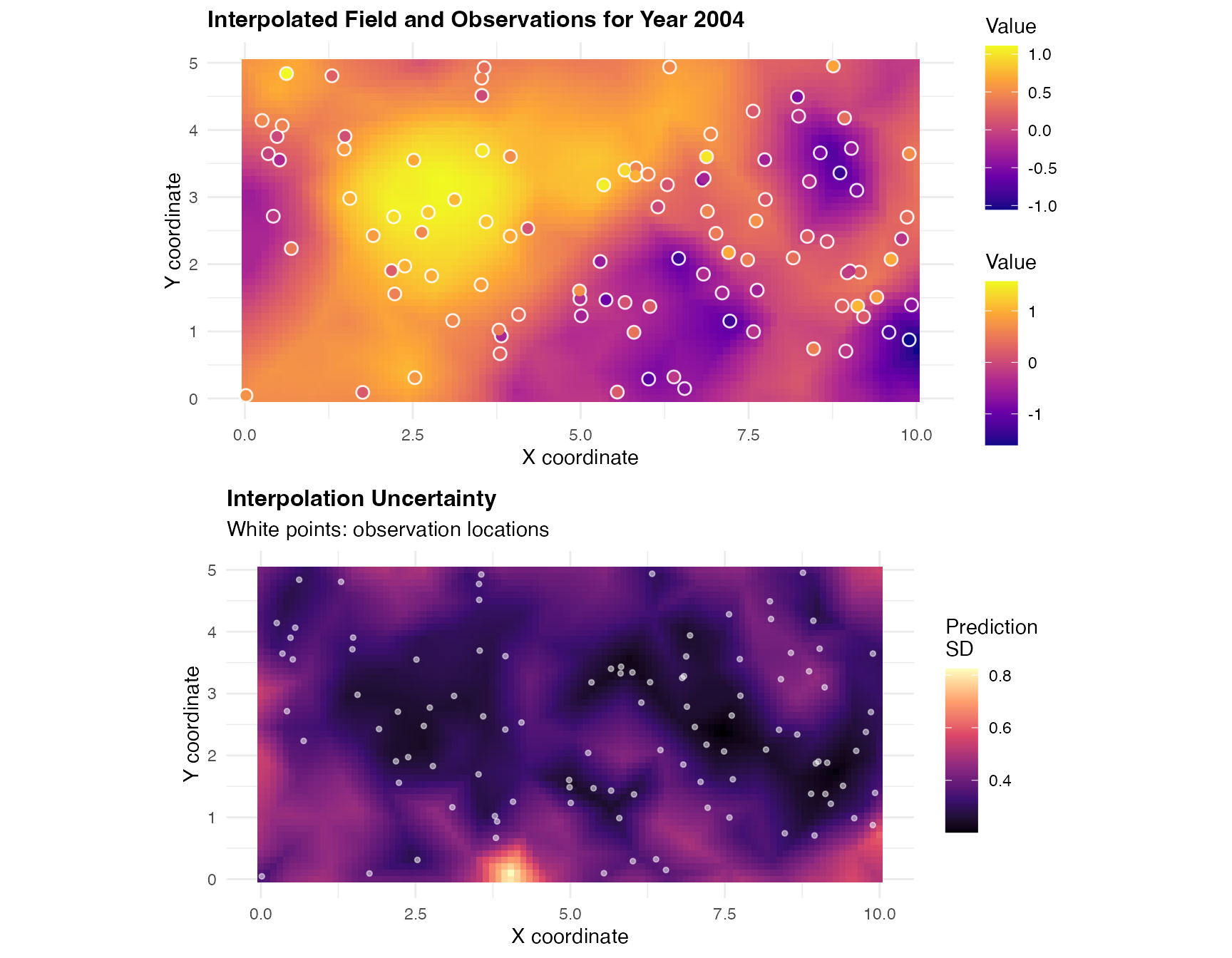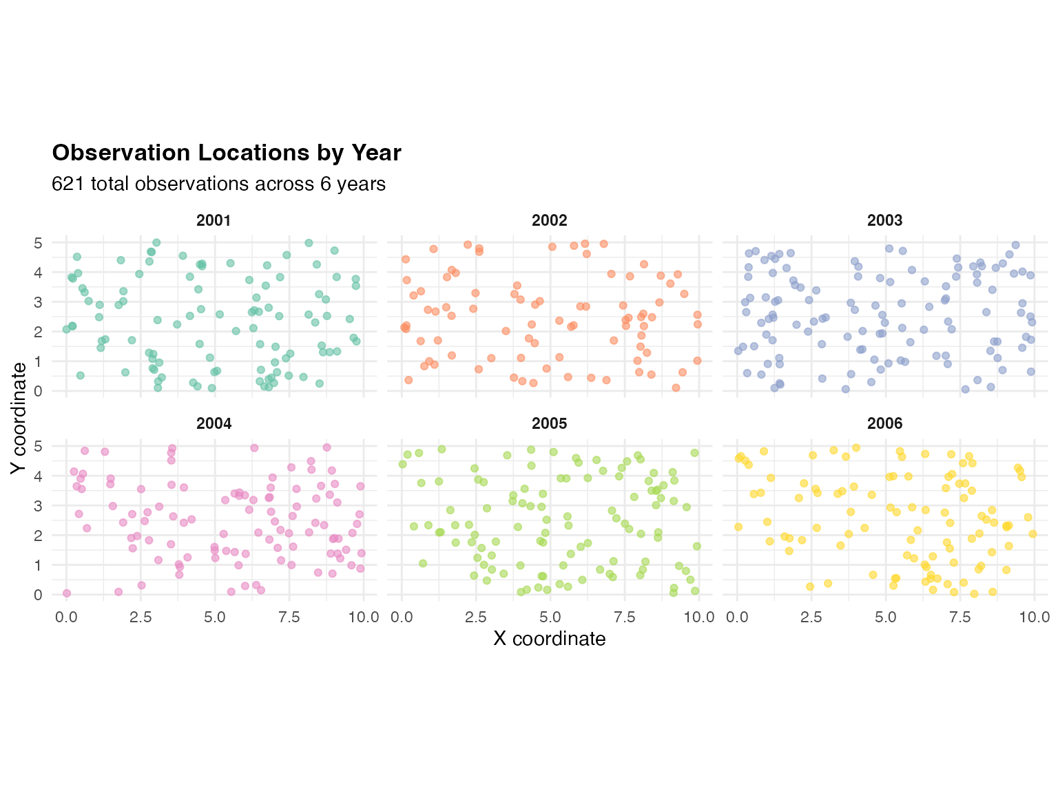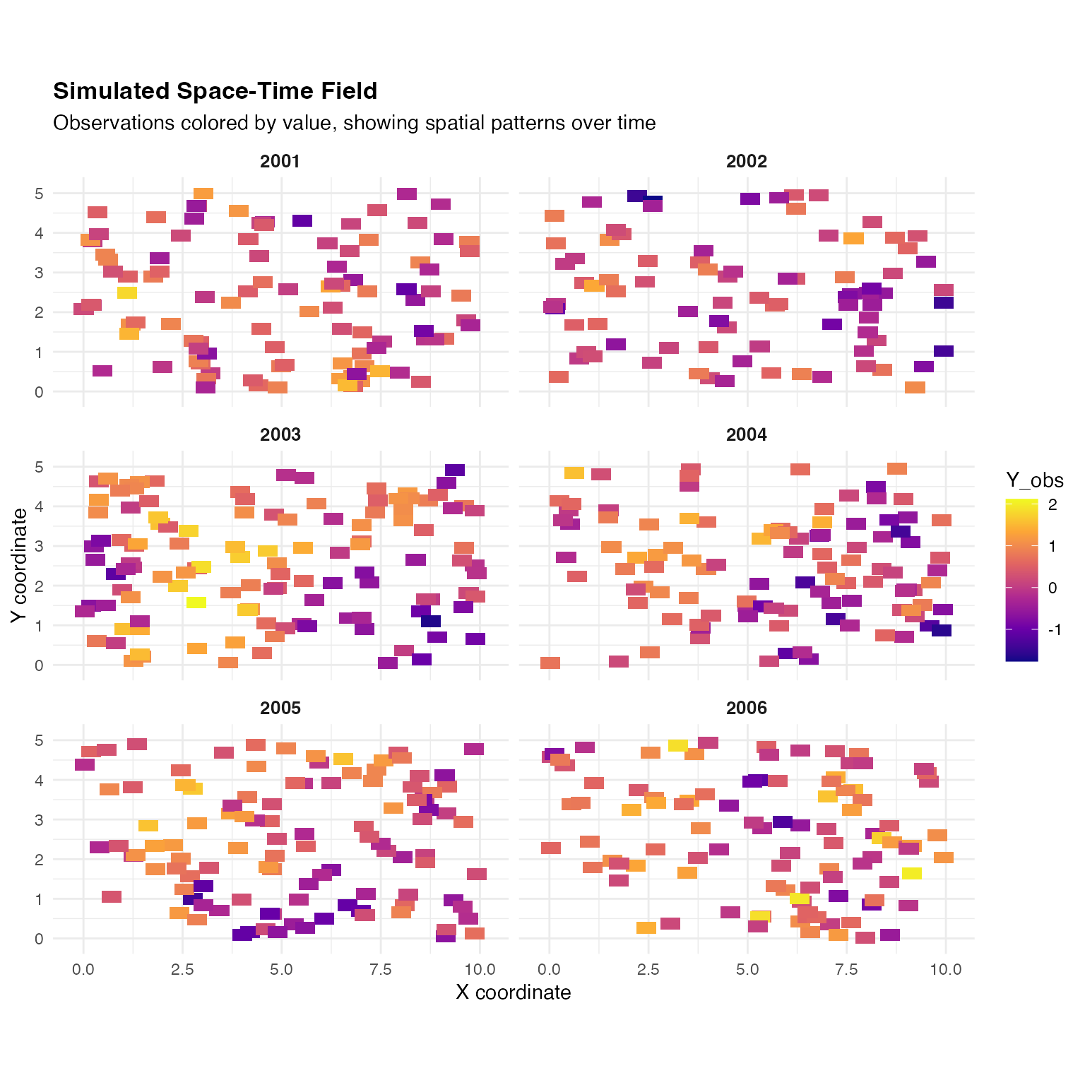 #> 10 10 2002 0.76 4.75We have 10 observations scattered across 4 years (2001-2004) and random spatial locations in a domain. This irregular sampling pattern is typical of real-world monitoring networks.