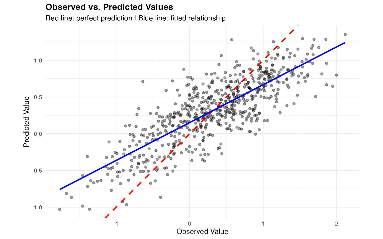 subtitle = "Red line: perfect prediction | Blue line: fitted relationship",
