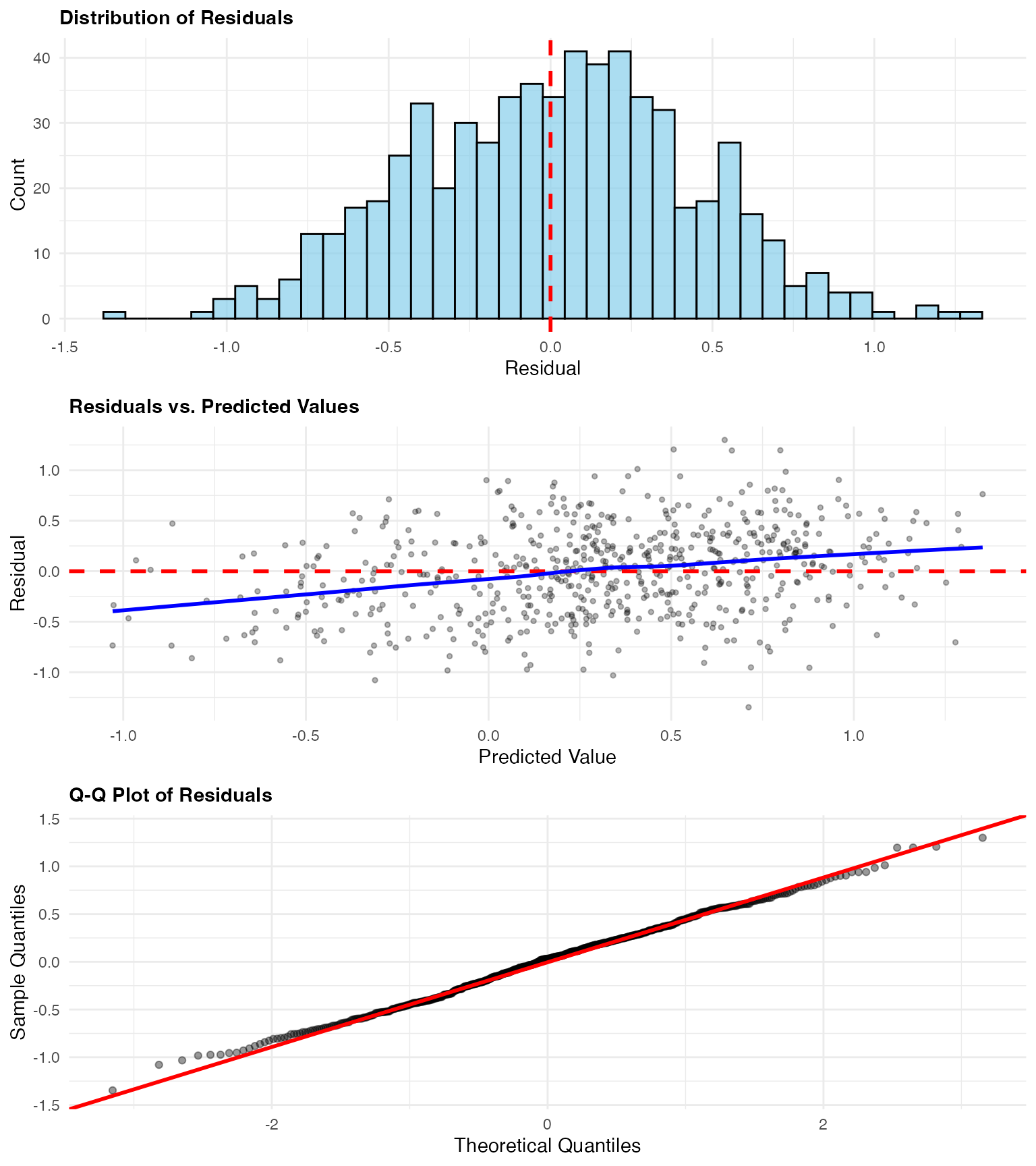 - Residuals vs. Predicted: No systematic patterns, indicating good model specification