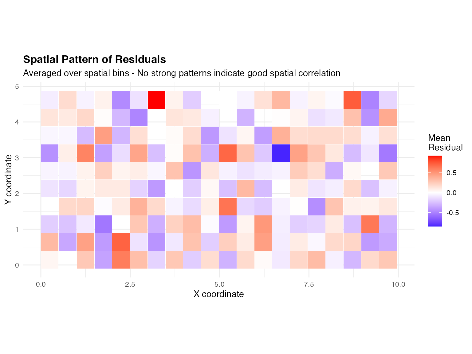 subtitle = "Averaged over spatial bins - No strong patterns indicate good spatial correlation",