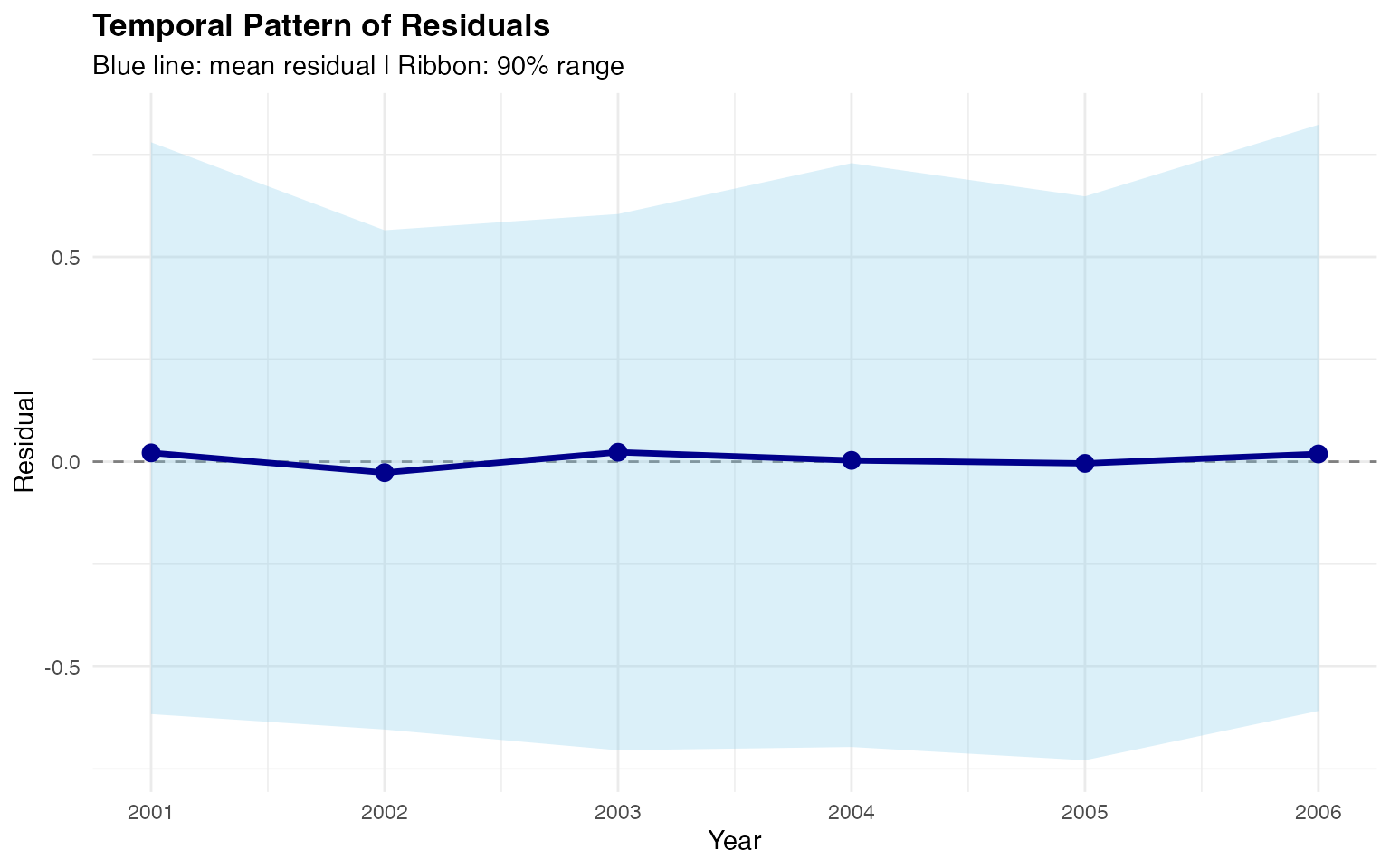 subtitle = "Blue line: mean residual | Ribbon: 90% range",