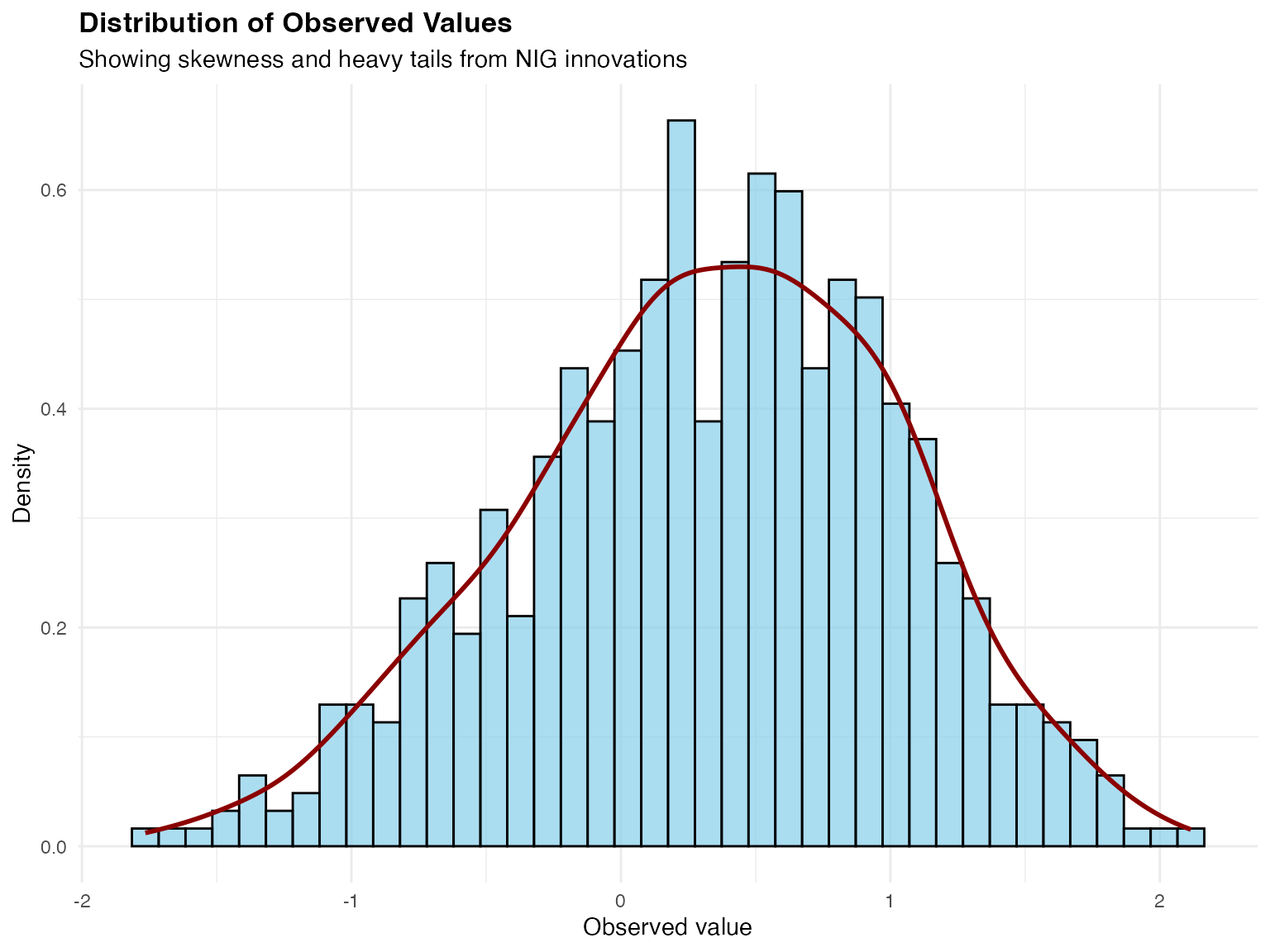 - Q-Q Plot: Deviations in tails reflect the non-Gaussian (NIG) structure of the data